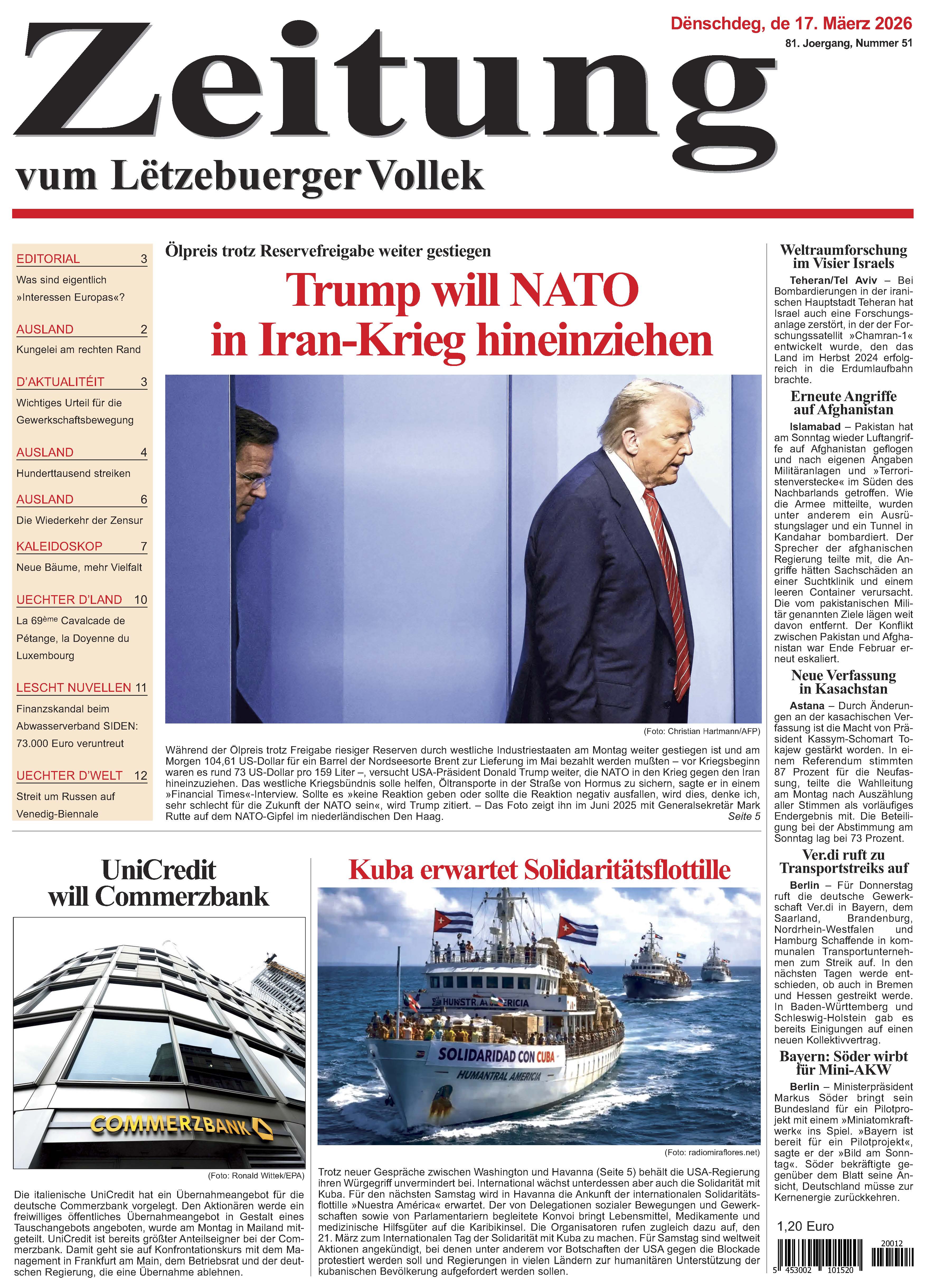 Die kommunistische Presse ist aber auch deshalb einzigartig hierzulande, weil sie nicht mit den Wölfen heult, sondern ohne Tabus über die Aufrüstung und darüber berichtet, wer daran verdient und was die Folgen sind, und im Zusammenhang mit dem Krieg in der Ukraine und anderen Kriegen, die Hintergründe aufdeckt. Das gefällt nicht jedem, und erst kürzlich versuchten CSV-Abgeordnete, die staatliche Pressehilfe für die »Zeitung« in Frage zu stellen.