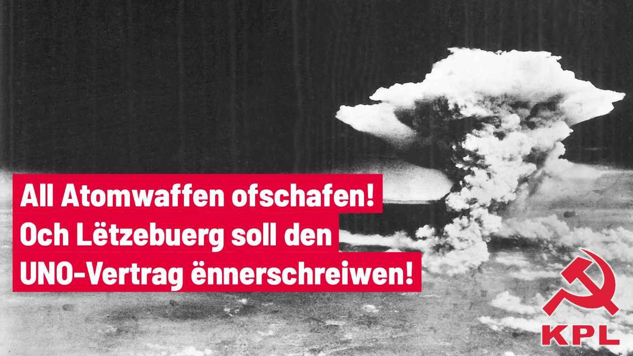 Die Kommunistische Partei Luxemburgs nimmt den 79. Jahrestag der bisher einzigen Einsätze von Atomwaffen zum Anlass, um die Luxemburger Regierung aufzufordern, den UNO-Vertrag über das Verbot von Atomwaffen zu unterzeichnen, und sich dafür einzusetzen, dass andere Staaten diesem Beispiel folgen.