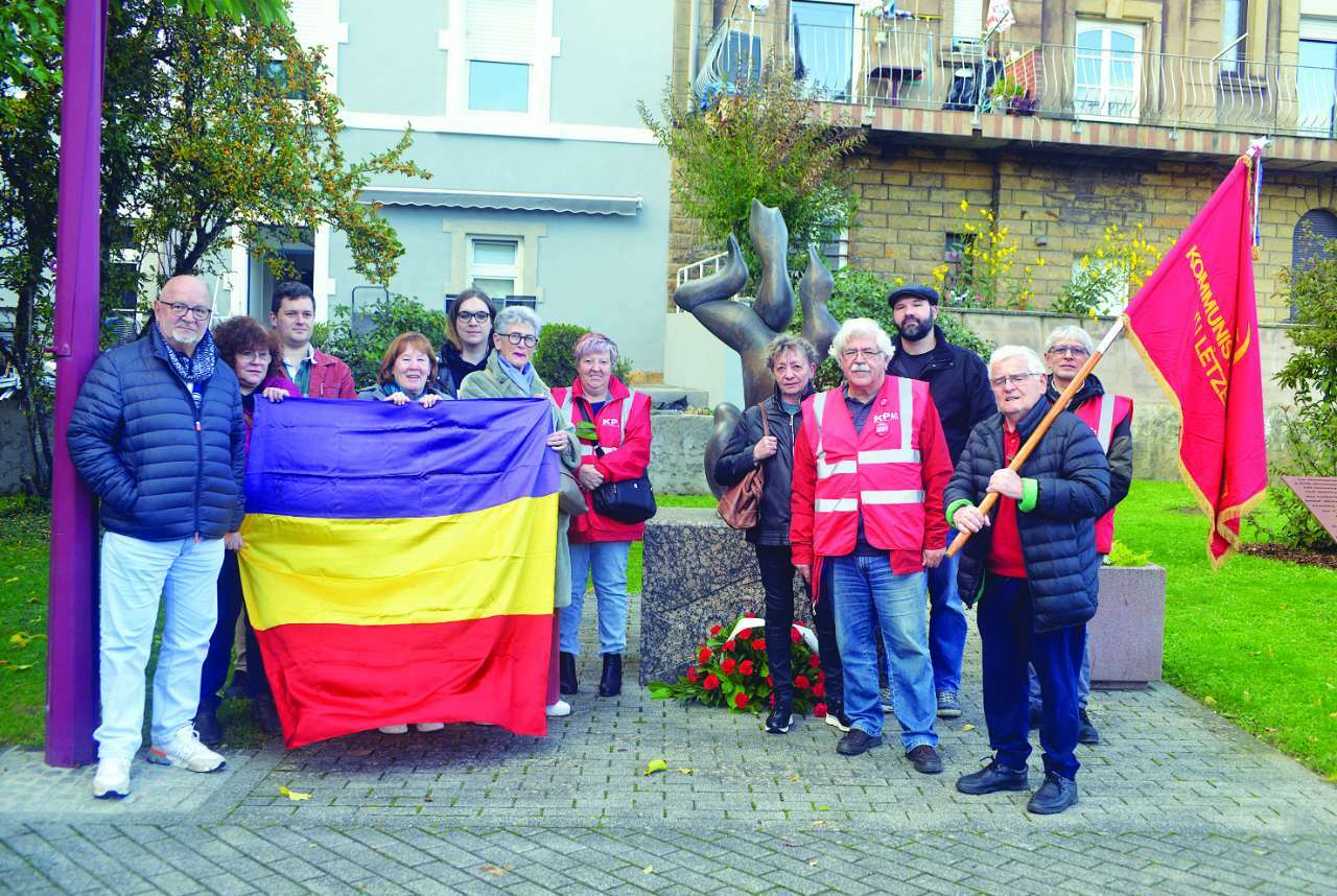 Am Samstag, dem 21. Oktober 2023 legte die KPL ein Gebinde mit roten Nelken am Denkmal »¡No Pasarán!« (Sie werden nicht durchkommen!) in Düdelingen-Gare-Usines nieder, um die »Spueniekämpfer« zu ehren, die ab Oktober 1936 von Luxemburg aus nach Spanien gingen, um die Republik mit der Waffe in der Hand gegen die faschistischen Putschisten von General Franco zu verteidigen.