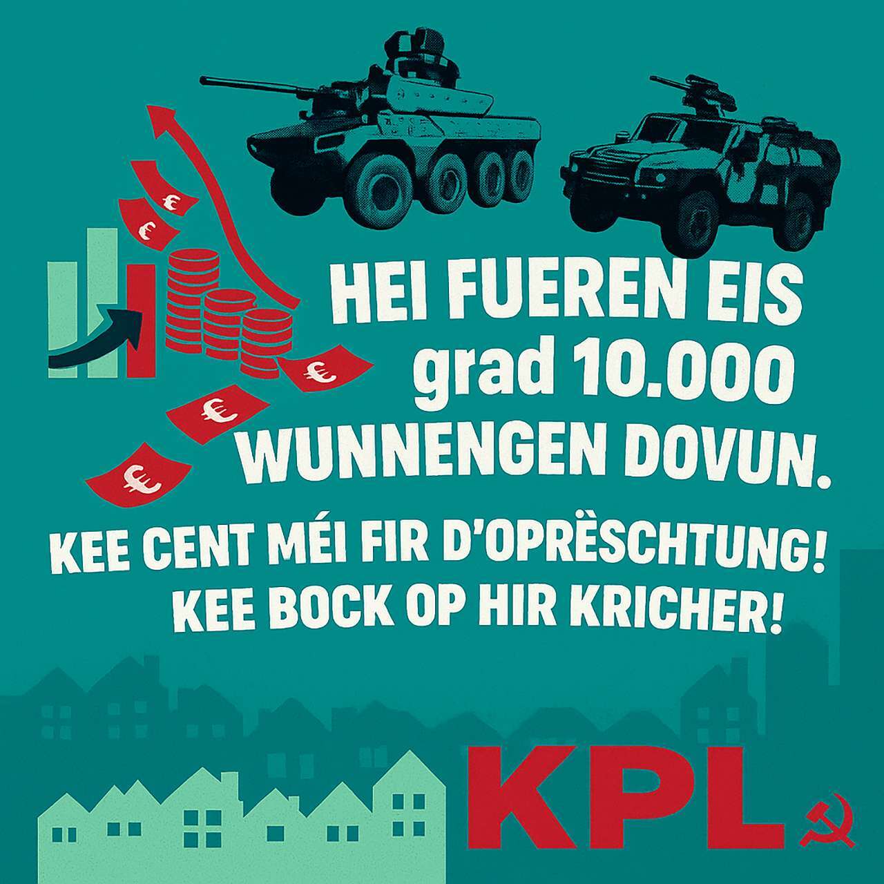 Um diese Verschwörung der »staatstragenden« Parteien, staatlichen Institutionen und privatem Kapital nach außen zu verkaufen, und zu erreichen, dass die Bevölkerung dem Rüstungswahn hinnimmt, wurde das Märchen von der Bedrohungslüge und dem »Ennemi mat der Pelzekap«, der uns demnächst überfallen werde, mit Hilfe der weitgehend gleichgeschalteten Presse neu aufgewärmt. Versprochen werden als Maßnahme zur Krisenbekämpfung, viele neue Arbeitsplätze, obwohl es ein offenes Geheimnis ist, dass Investitionen im Rüstungsbereich weitaus weniger Arbeitsplätze schaffen, als das auf die zivile Produktion zutrifft.