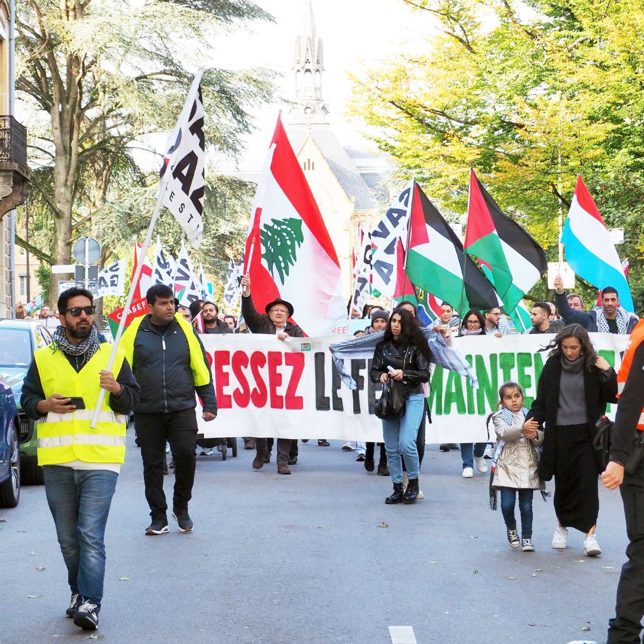 Inzwischen wird in Sprechchören auch ein Ende der Bombardierungen im Libanon und in Syrien und ein Rückzug der israelischen Armee aus dem Süden des Libanon gefordert, und Premier Frieden und Außenminister Bettel werden aufgefordert, Palästina als Staat anzuerkennen.