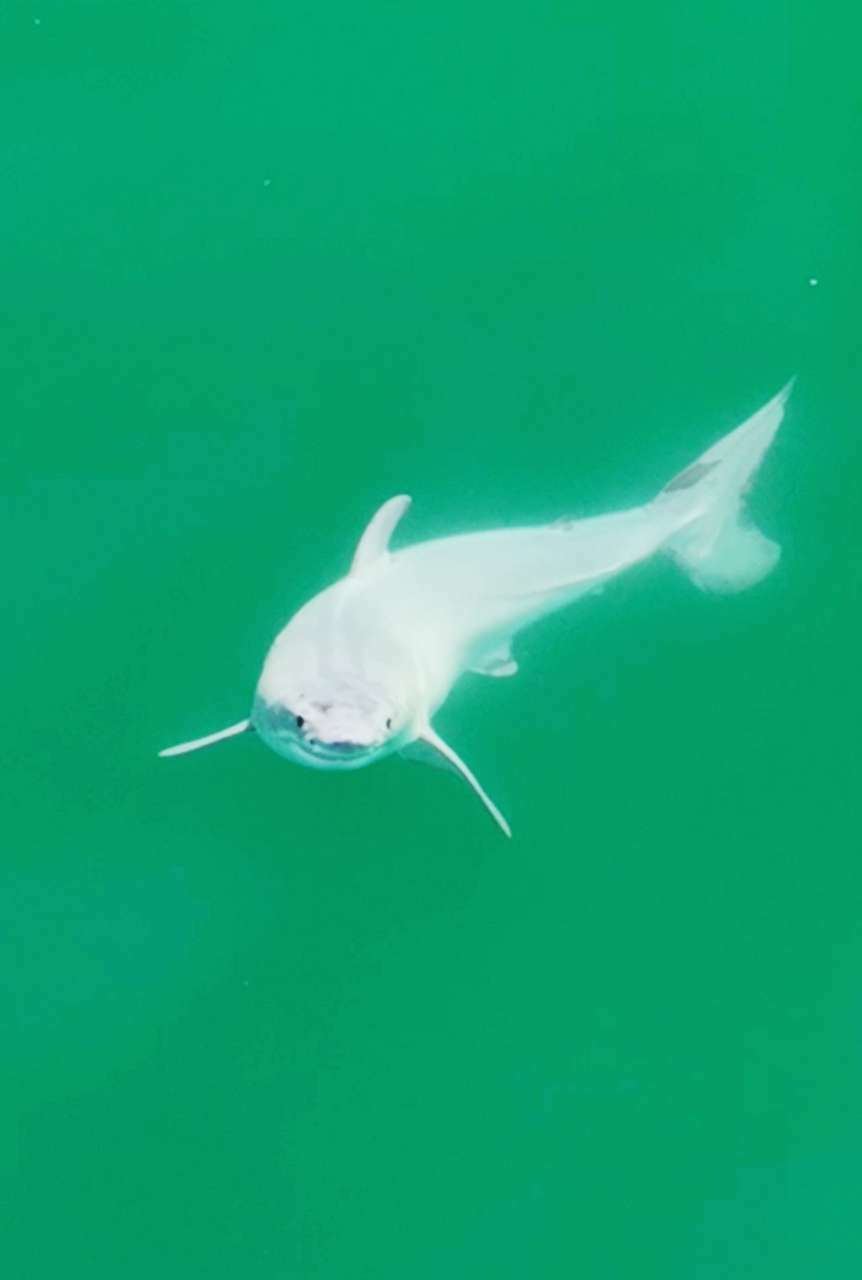 Der Hai sei im Juli in den Gewässern vor Südkalifornien von einer Drohnenkamera gefilmt worden, schreiben die Autoren. Er sei rund anderthalb Meter lang und komplett weiß gewesen. Erwachsene Tiere sind dagegen oben grau und unten weiß. Bei genauerer Betrachtung der Fotos und des Videofilms, sei zu sehen gewesen, daß eine weiße Schicht vom Körper abgestreift wurde, während der Hai schwamm. »Ich glaube, es war ein neugeborener Weißer Hai, der seine embryonale Schicht abwarf«, sagt Doktorand Sternes.