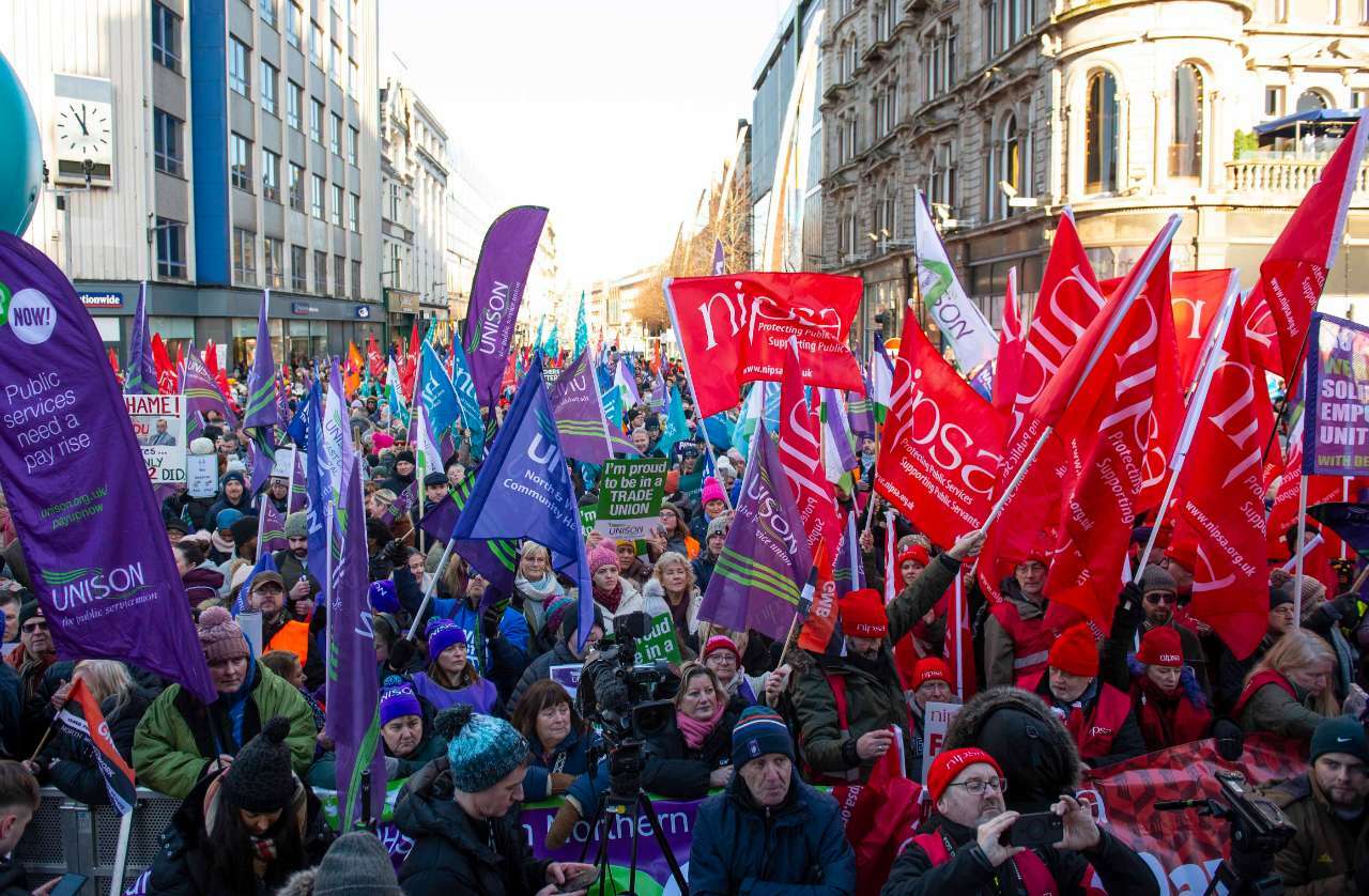 Nordirland hat einen der größten Streiks seiner jüngeren Geschichte erlebt: Beschäftigte des öffentlichen Dienstes fordern höhere Löhne und bessere Arbeitsbedingungen. Mehr als 100.000 Menschen beteiligten sich am Donnerstag an dem Ausstand, zu dem 16 Gewerkschaften aufgerufen hatten, unter anderem von Kliniken, Behörden und Bildungseinrichtungen. Bus- und Bahnverbindungen waren unterbrochen und Schulen geschlossen. Tausende protestierten bei einer Großkundgebung in Belfast (Foto).