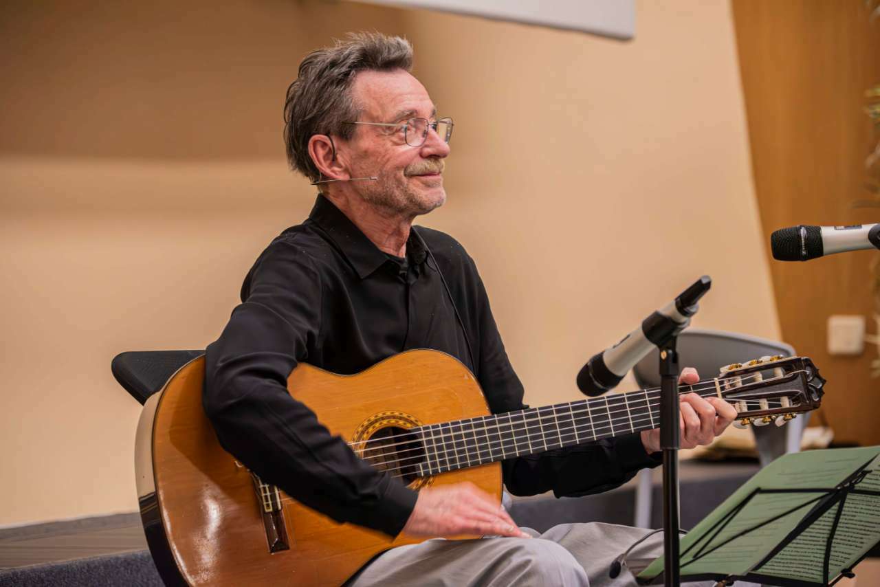 Guy Schons est né en 1950. Ses qualités de chanteur et de musicien sont connues et reconnues par un nombreux public. La preuve, lors de la soirée à laquelle nous avons assisté dans le Grand Auditorium de la City Bibliothèque, il n’y avait plus une seule place de disponible.
