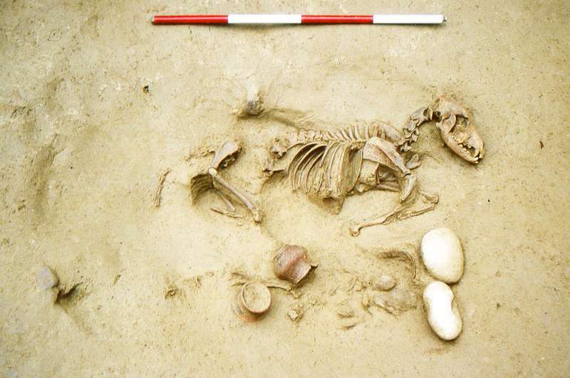 Generell sind die bestatteten Menschen sehr unterschiedlich. So fanden die Forscher zum Beispiel ein mit einem kompletten Hundeskelett beerdigtes Neugeborenes (Foto), eine Frau, die mit einem ganzen Pferd und Teilen mehrerer anderer Pferde begraben wurde, sowie einen Mann mittleren Alters mit einem kleinen Hund.